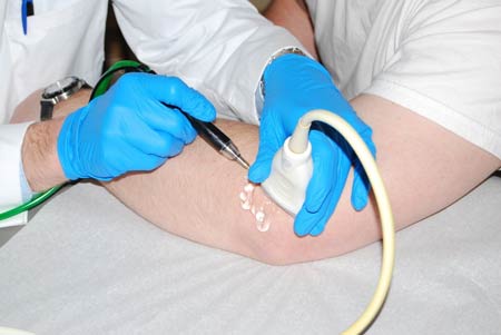 می‌توان از اولتراسوند تراپی به ‌عنوان یک روش درمانی برای آسیب‌های ورزشی از جمله آرنج گلف بازان استفاده کرد. در این روش معمولاً یک پروب فلزی کوچک بر روی پوست قرار داده می‌شود که امواج فراصوت از خود ساطع می‌کند. اولتراسوند با جذب ماستوسیت‌های بیشتر به منطقه‌ی آسیب‌دیده، طی شدن دوره‌ی التهاب را سریع‌تر می‌کند. اولتراسوند همچنین تولید کلاژن بیشتر را تحریک می‌کند که پروتئین اصلی در بافت‌های نرم از جمله تاندون‌ها و رباط‌هاست.